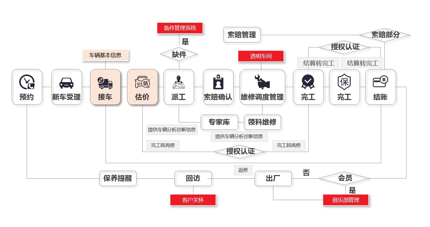 系統(tǒng)模塊是完全按照4S店售后部門及大中型修理廠來設計,每一個模塊對應一個部門。為企業(yè)提供了汽車4S店標準的維修接待---檢測估價---派工---維修領料---完工---質(zhì)檢---結(jié)算---回訪的流程管理,系統(tǒng)并根據(jù)該流程自動生成公司管理層所需的各項報表,并加以人性化的輔助模塊如(保養(yǎng)估算及邀約、預約提醒、會員管理)提升維修客戶的滿意度。