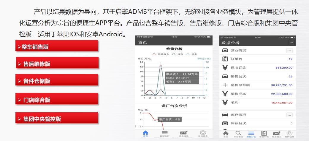 啟擎智能運(yùn)營(yíng)BI管理系統(tǒng)V2.8產(chǎn)品以結(jié)果數(shù)據(jù)為導(dǎo)向,基于啟擎ADMS平臺(tái)框架下,無(wú)縫對(duì)接各業(yè)務(wù)模塊,為管理層提供一體化運(yùn)營(yíng)分析為宗旨的便捷性APP平臺(tái)。產(chǎn)品包含整車銷售版,售后維修版、門店綜合版和集團(tuán)中央管控版,適用于蘋果IOS和安卓Android。